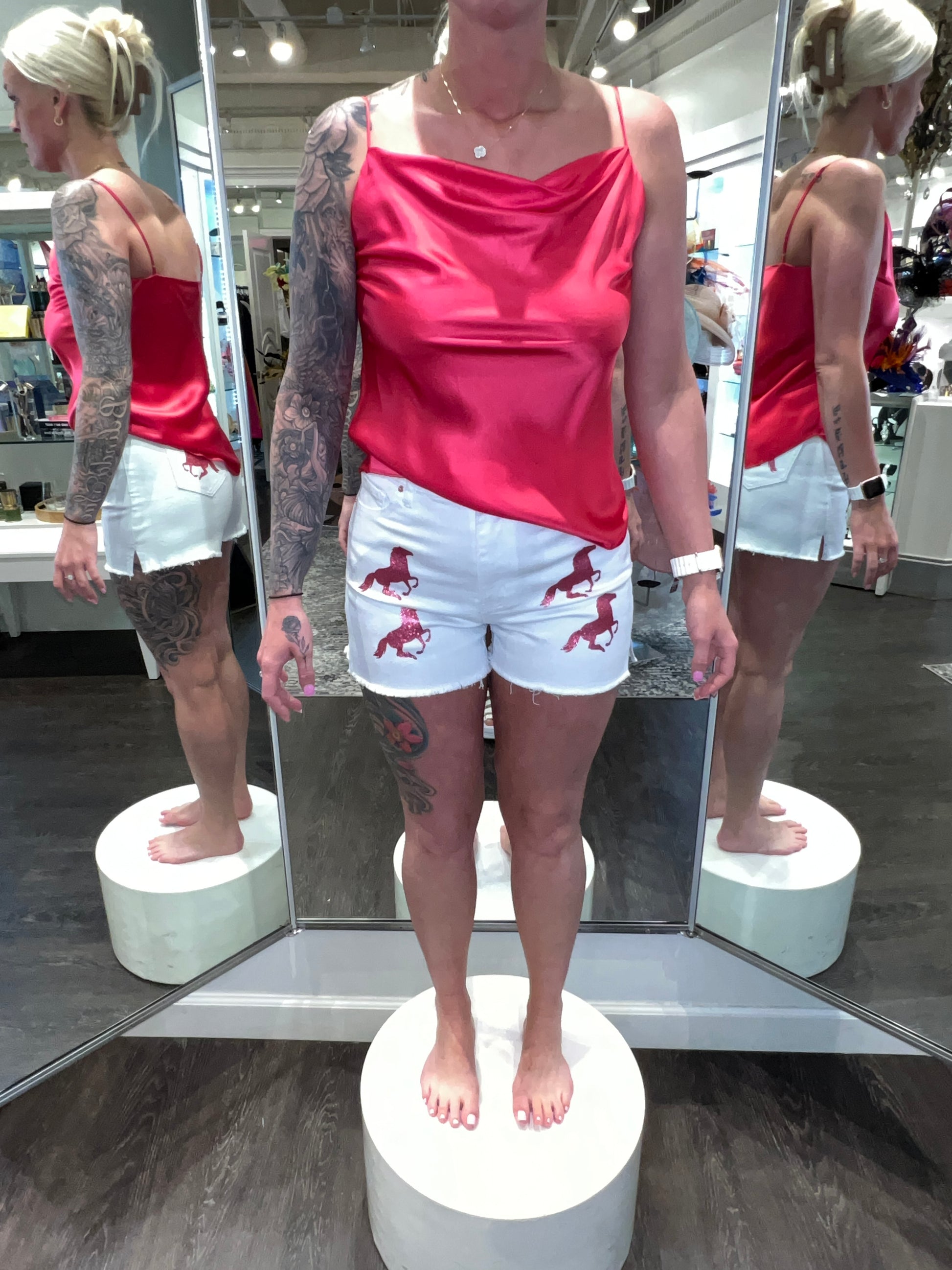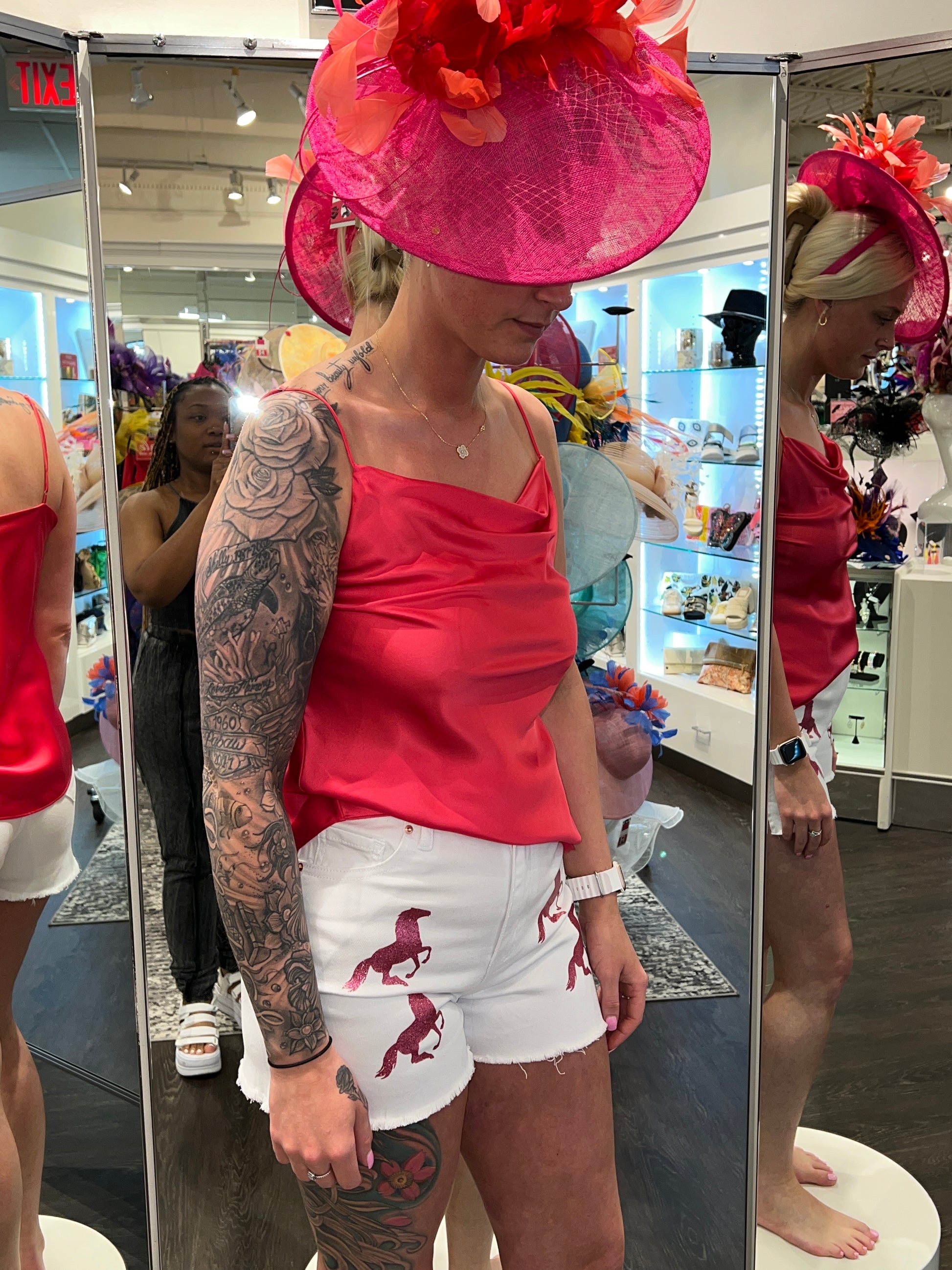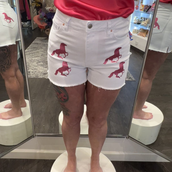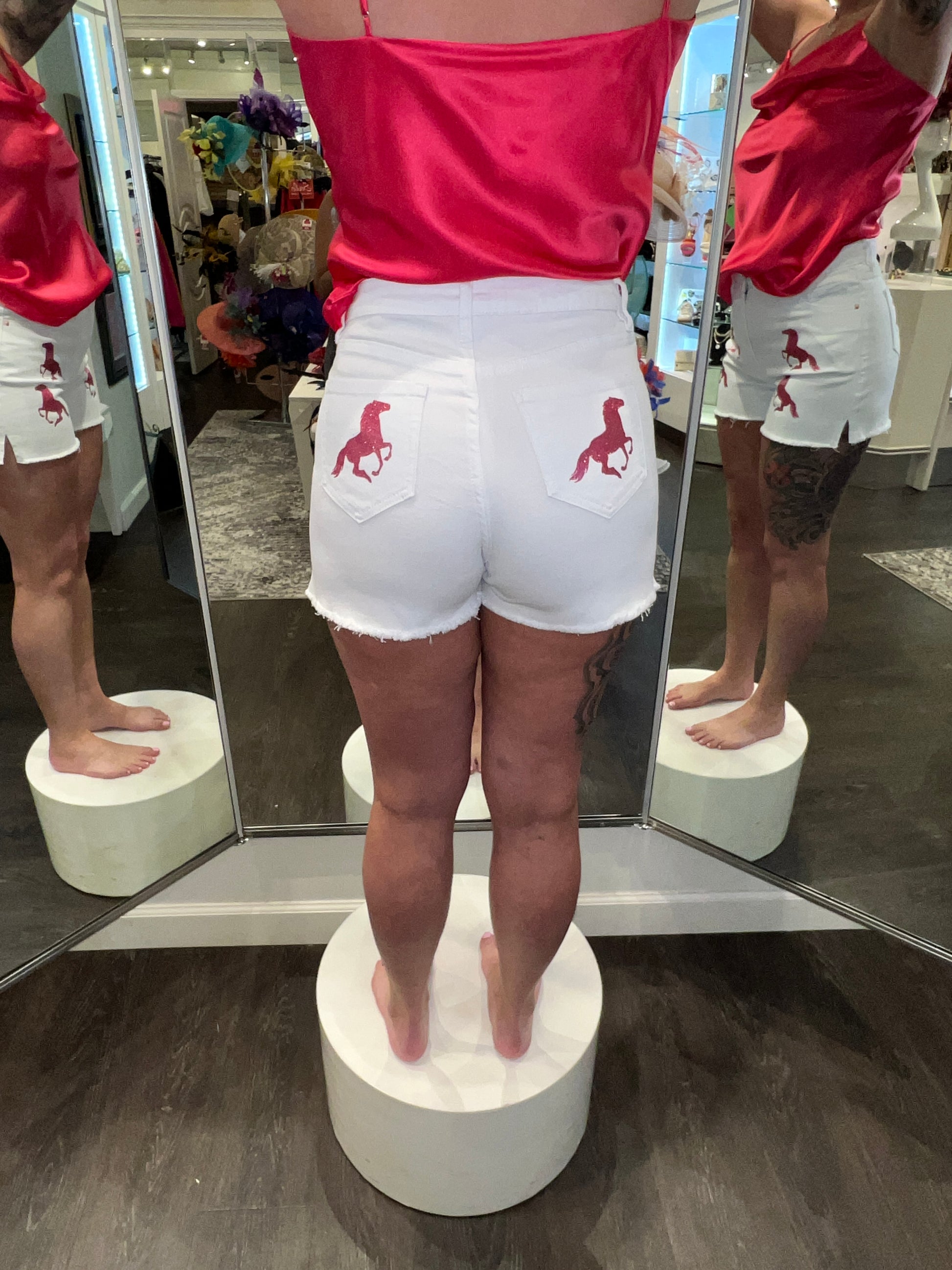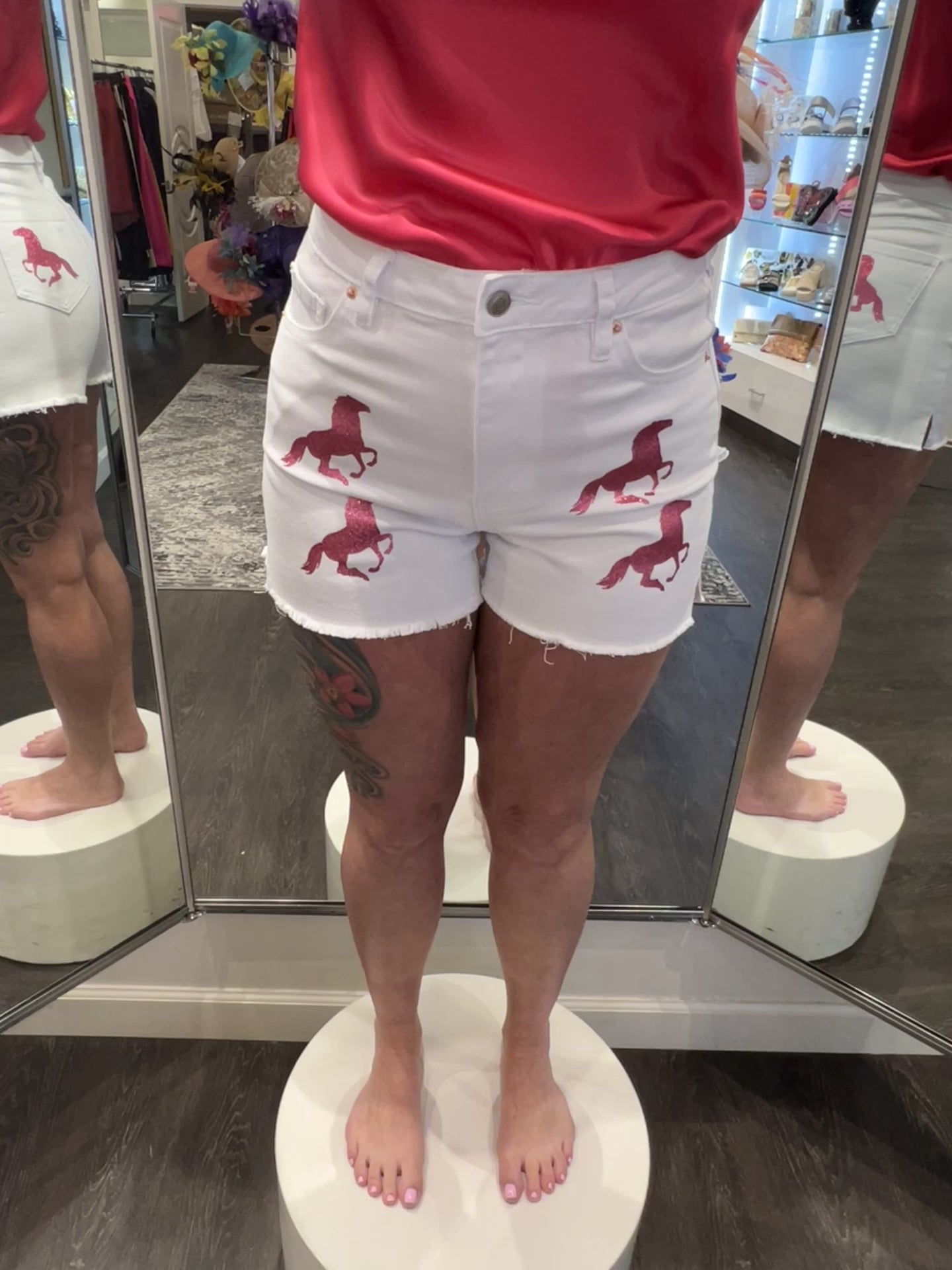 White short embellished with sparkling Kentucky Derby horses all over. Short is high-waisted and have excellent stretch. Custom colors are available until April 15, 2024. To order custom colors write in your color request on the "my cart" page under "order special instructions" text box.