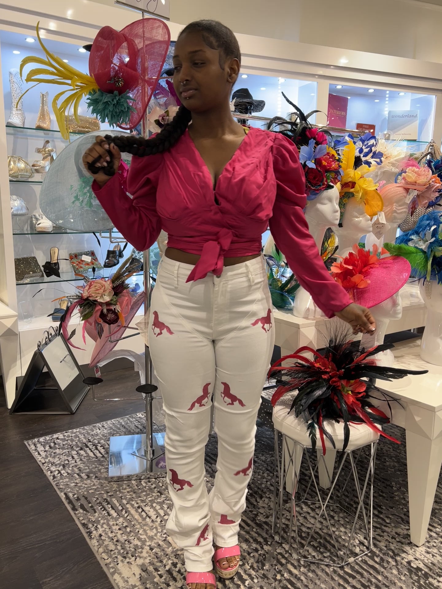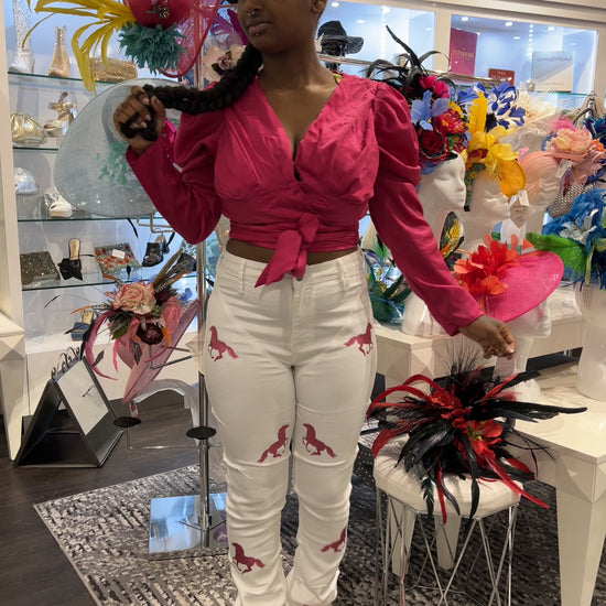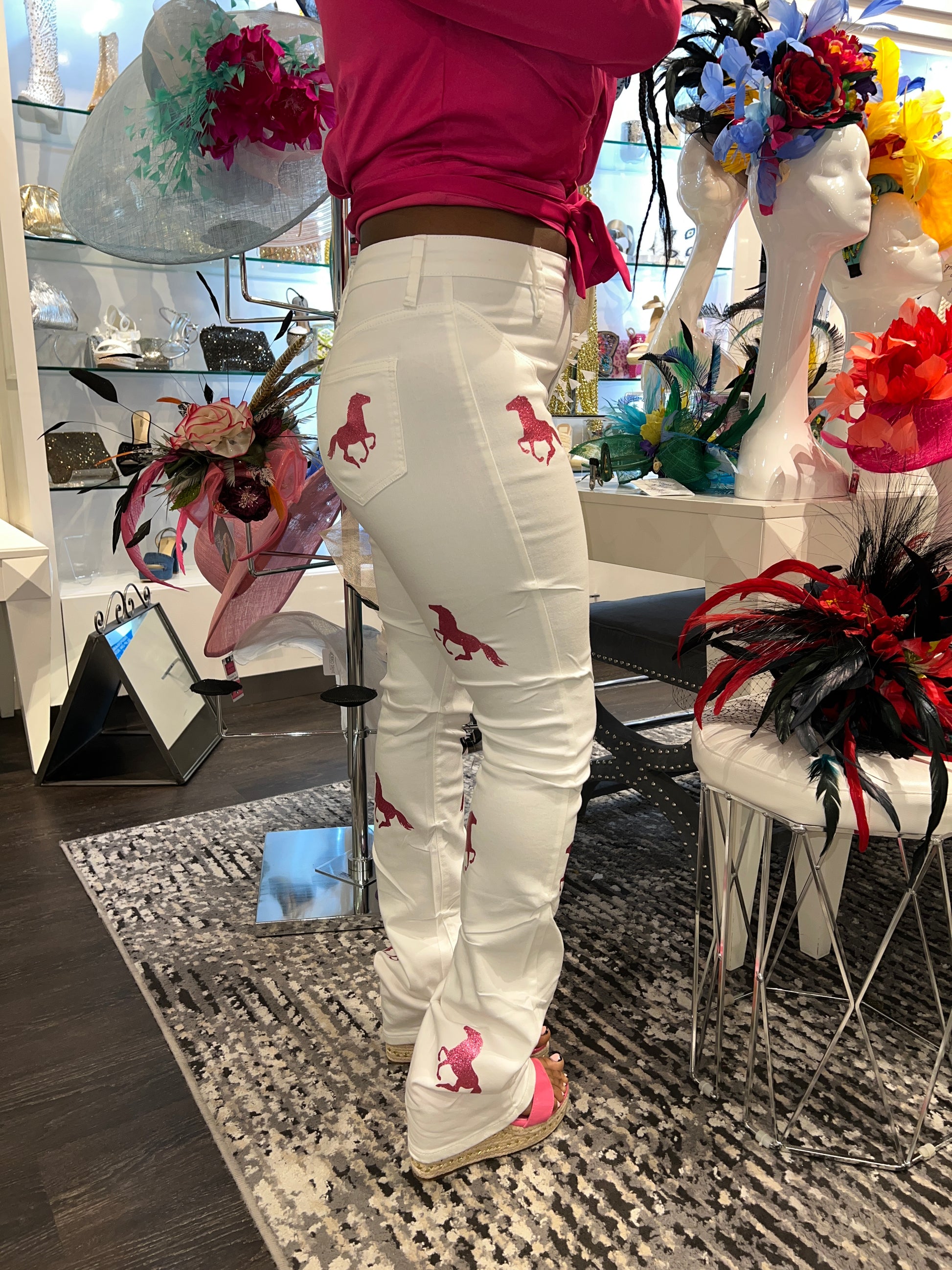 White jeans embellished with sparkling Kentucky Derby horses all over. Jeans are high-waisted and have excellent stretch. Custom colors are available until April 15, 2024. To order custom colors write in your color request on the "my cart" page under "order special instructions" text box.